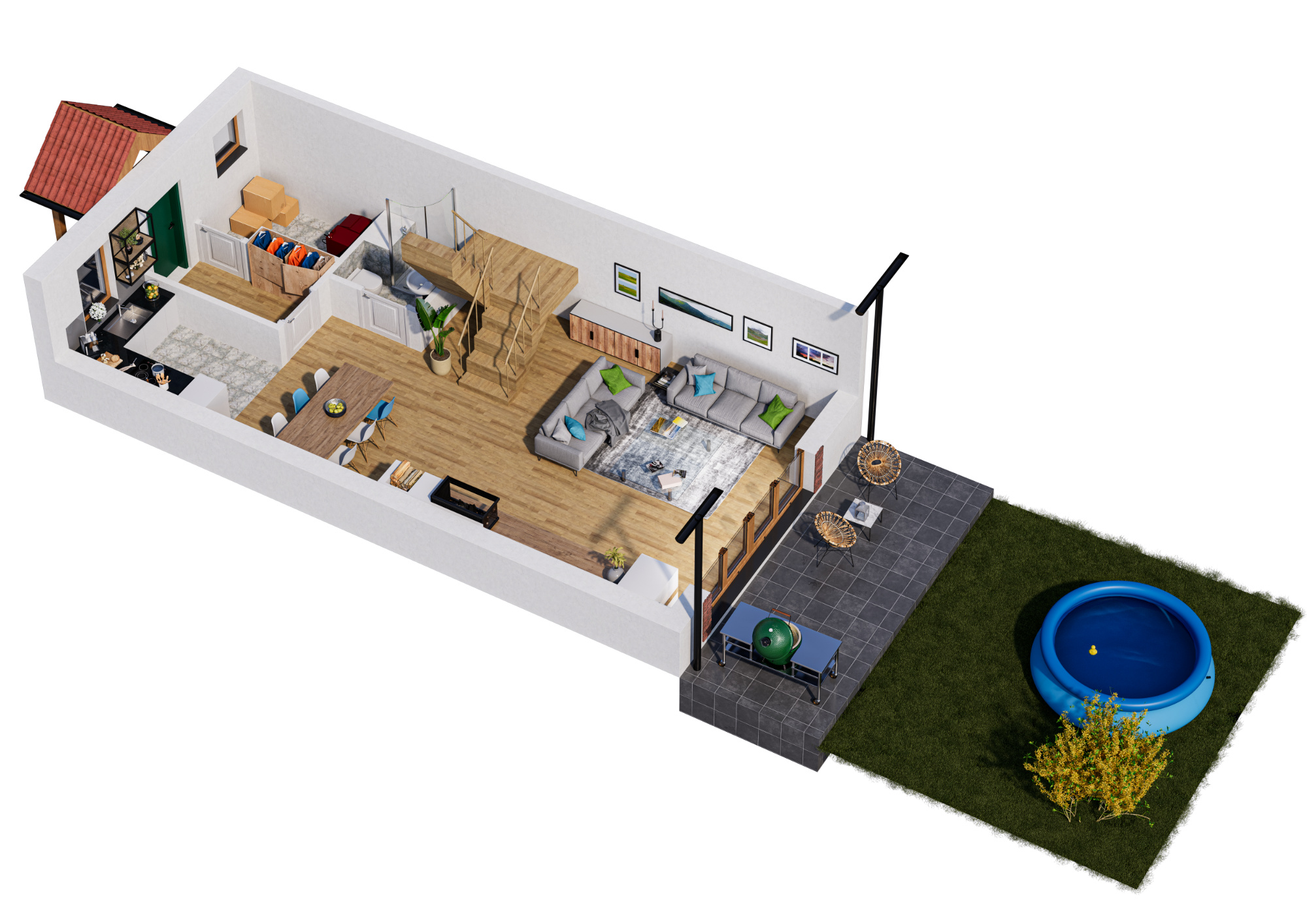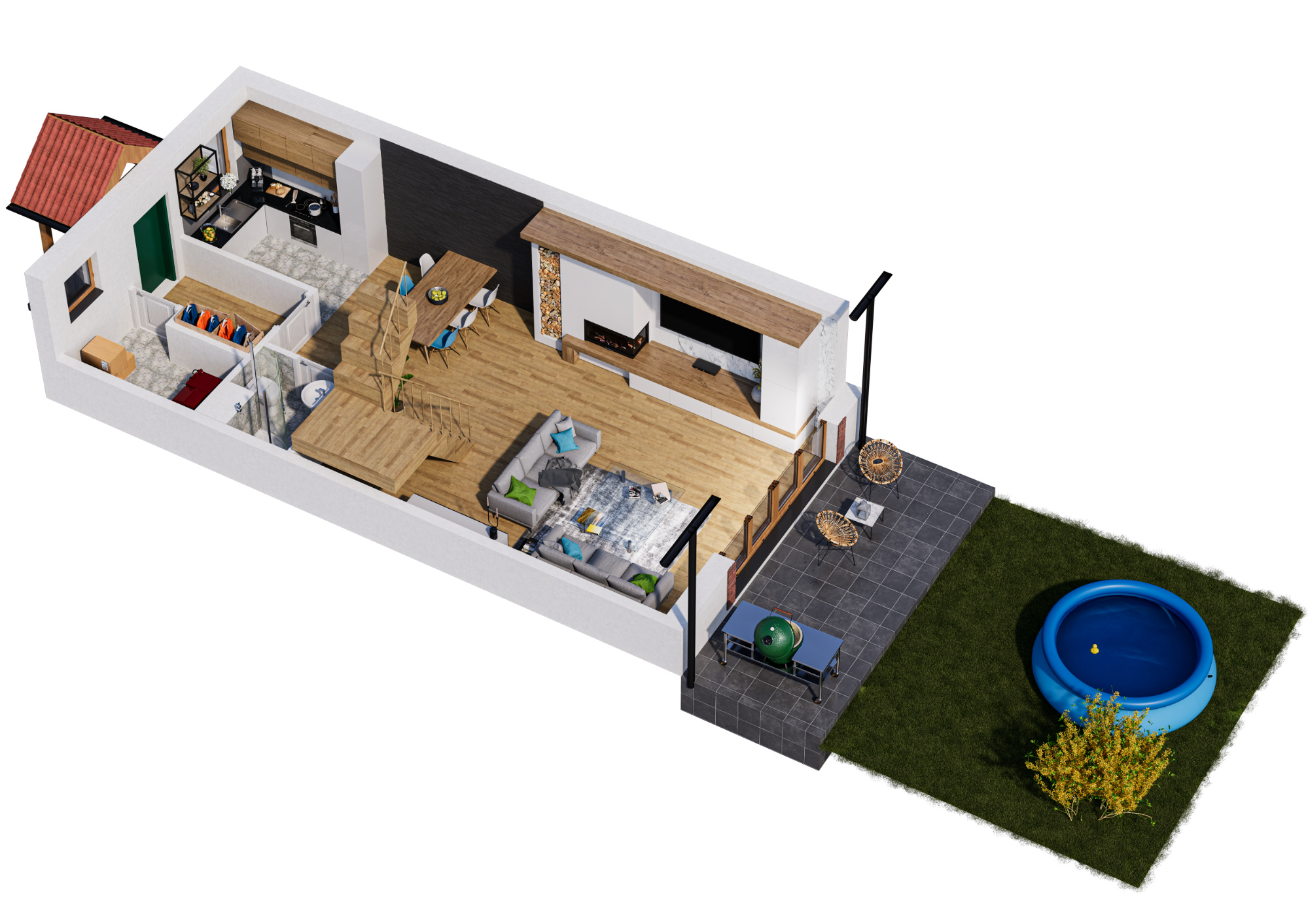 Twój nowy dom ma 110 mkw. powierzchni użytkowej. Na parterze znajdziesz wiatrołap z miejscem na szafę i kotłownię, która może służyć także jako pomieszczenie gospodarcze. Idąc dalej zobaczysz pokój dzienny z dużymi witrynami wspaniale rozjaśniającymi całe wnętrze, z których możesz wyjść bezpośrednio na swój własny taras i ogród. Po drugiej stronie salonu ujrzysz jadalnię oraz otwartą kuchnię ale jeśli tego chcesz możesz ją odgrodzić ścianką od reszty pomieszczenia. Przy schodach znajdziesz toaletę z miejscem na prysznic. Dodatkowo by przestrzeń była jak najbardziej wykorzystana, pod schodami możesz umiejscowić schowek na etapie wykończenia.