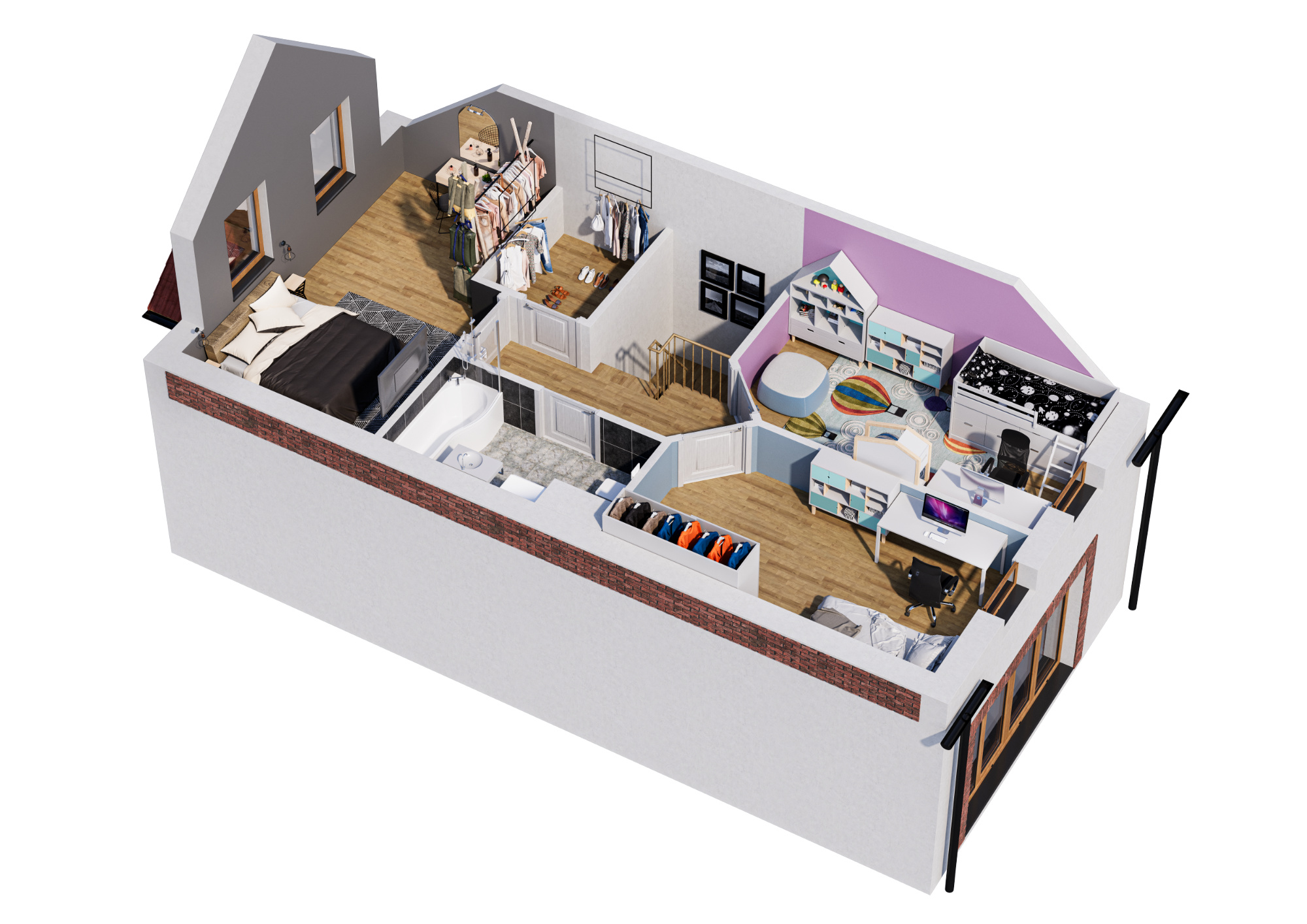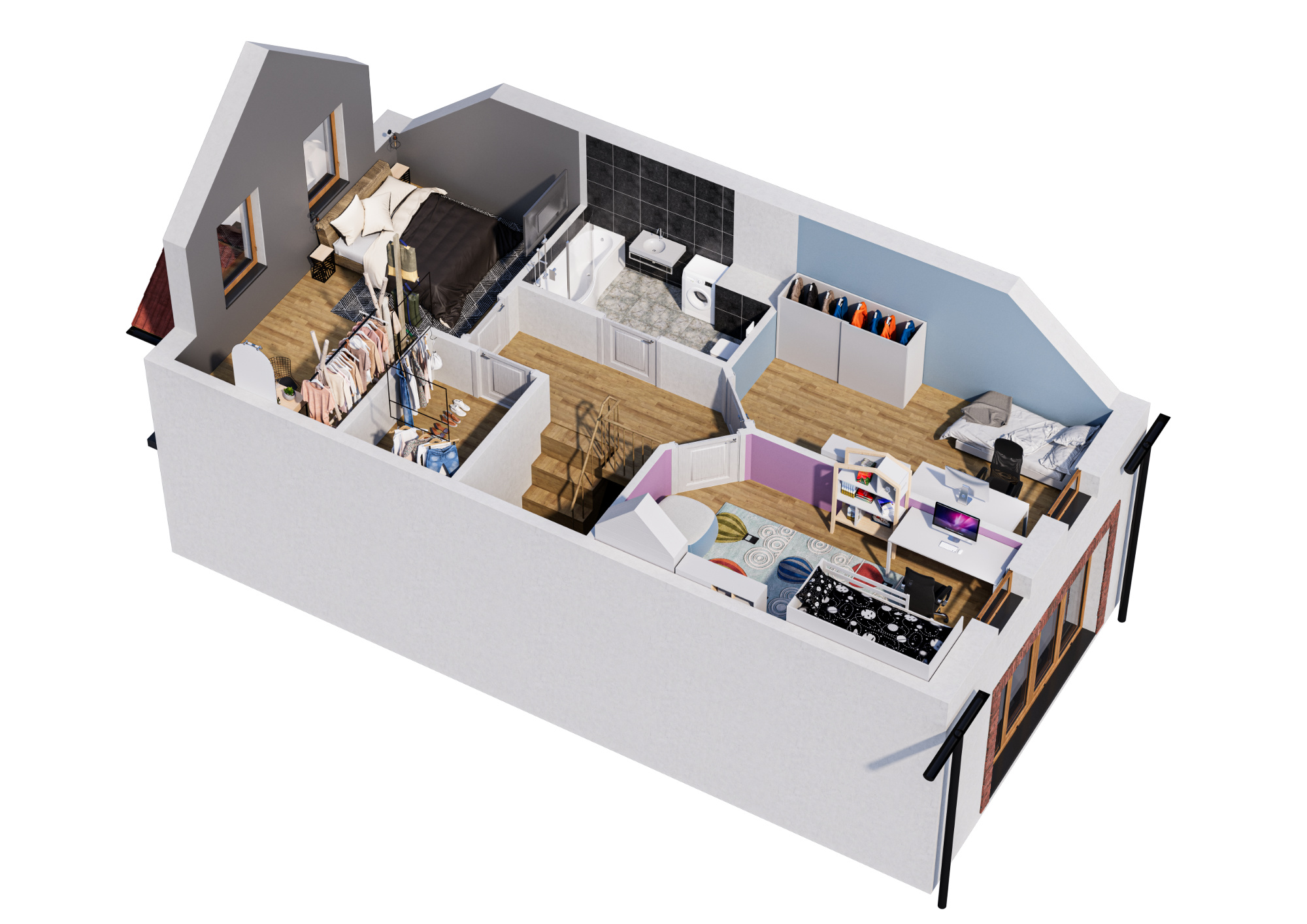 Gdy pójdziesz schodami na piętro to znajdziesz tam korytarz, z którego wejdziesz bezpośrednio do dwóch pokoi dziecięcych, dużej komfortowej sypialni z możliwością podziału by móc urządzić dodatkowy pokój na sypialnię lub biuro jeśli masz większe potrzeby. Z korytarza wejdziesz również do przestronnej łazienki z miejscem na wannę i garderoby w której pomieścisz odzież wszystkich swoich domowników. Co ważne dom posiada duży, wysoki strych, który daje dodatkową przestrzeń którą możesz zaaranżować w dowolny sposób np. pokój zabaw dla dzieci, biuro, czy sypialnię gościnną.